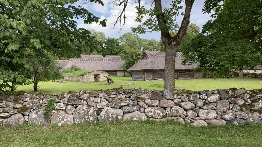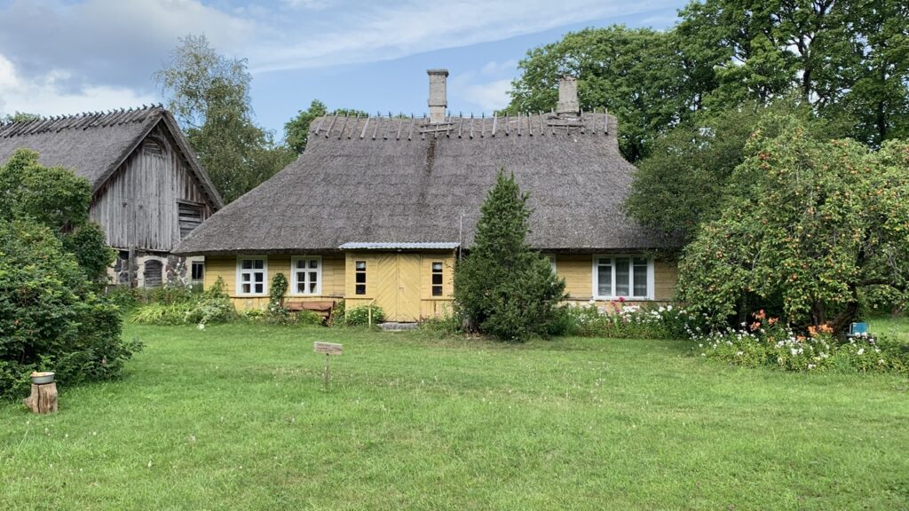 Al snel na het aanmeren komen we bij het openluchmuseumpje van Muhu, het 1e eiland. Leuk om er even rond te kijken. Een soort museumdorp waar ook nog steeds nazaten wonen van de familie die er in 1920 zijn intrek nam: de stamvader die met z’n 1e en 2e vrouw uiteindelijk 9 dochters en 3 zonen kreeg. De jongste, Juhann, werd een belangrijk Ests schrijver en erfde de boel.