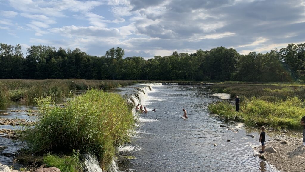 Als we na een heerlijk etentje ‘s avonds op onze kamer zitten horen we een soort folkmuziek. Luid. En lang. We worden nieuwsgierig en willen weten wat er gaande is. Buiten ontmoeten we een Duitse professor die op weg naar zijn werk in Tallinn een tussenstop in Kuldiga neemt en we lopen samen richting het geluid. Er blijkt een muziekfeest aan de gang te zijn. Een podium, eet- en drinkstalletjes, vuurkorven en muziek. Midden op het terrein zijn twee cirkels gecreëerd van hooibalen met kleden eroverheen. Als de band ophoudt met spelen gaat men op de hooibalen zitten en gezamenlijk worden er Letse volksliedjes gezongen. Heel gaaf. Maar het duurt wel bijna de hele nacht. En dat is iets minder.