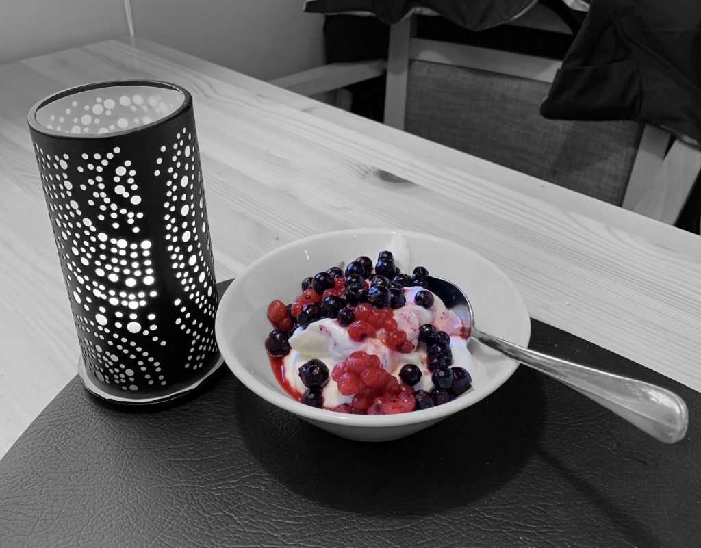 Als een soort marsmannetjes zaten we met drie lagen kleding in een soort oversized overall met handschoenen aan te eten. En natuurlijk weer van alles opgemerkt. De twee vrouwen naast ons (moeder en dochter) die echt zaten te genieten maar de hele maaltijd drie woorden tegen elkaar gesproken hebben. Het (samengestelde) gezin achter ons met 4 kinderen die nog geen hele minuut echt met zijn 5en aan tafel hebben gezeten. Er was er altijd wel eentje weg. De Belgen schuin achter ons waar een van hen met een enorme Sami-muts op doorlopend foto’s-met-flits aan het maken was, de anderen uit het groepje dirigeerde naar andere ruimten of andere tafels om ook daar een foto te kunnen maken. En tenslotte het gezin aan onze linker kant waarvan de moeder niets mocht eten (geen knoflook, geen ei, geen zuivel, geen aardappel) en daar zelf de hele tijd erg om moest lachen.