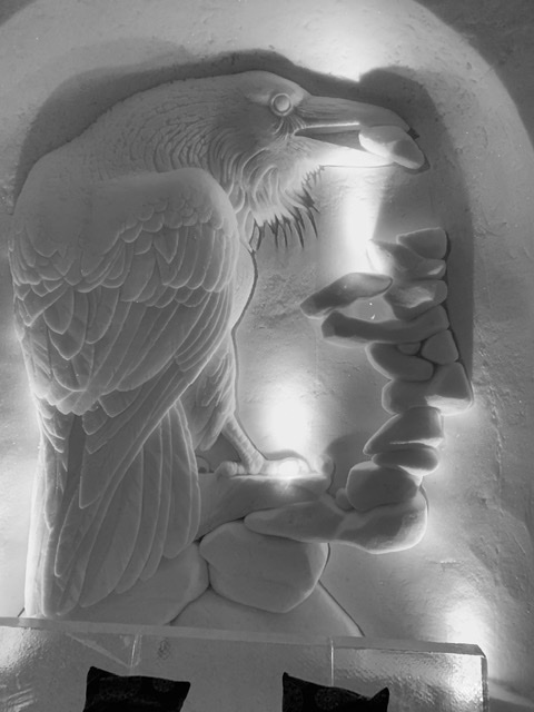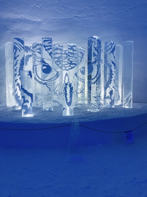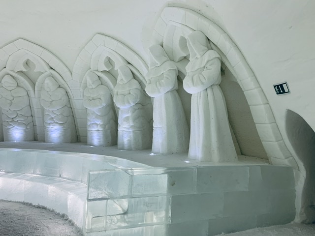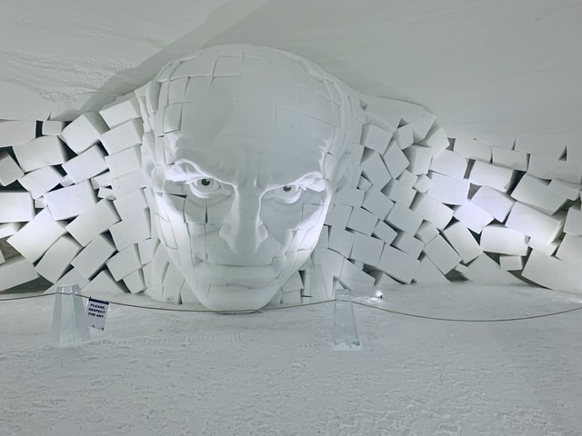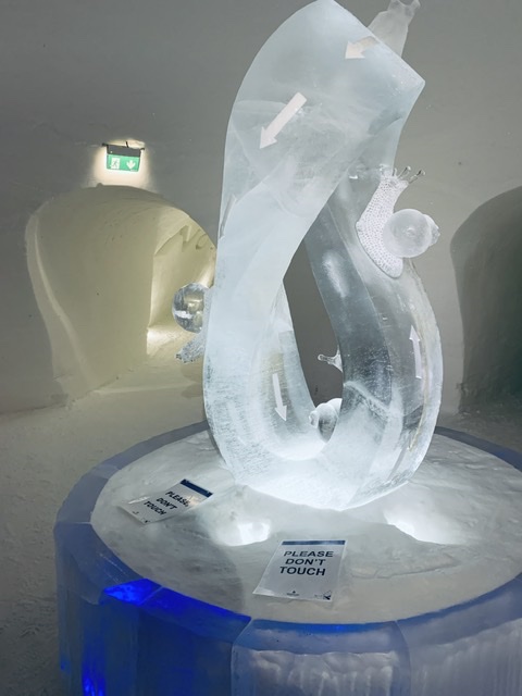 ‘s Avonds op naar het IJshotel. Het hotel, dat wil zeggen een deel van het restaurant, alle kamers, de bar en de entree zijn helemaal opgebouwd uit sneeuw. Dat doen ze door een enorme berg sneeuw te maken en daar vervolgens middels een soort van ballonnen ruimtes in te maken die daarna met de hand ‘geplamuurd’ worden. Als dat klaar is komen er kunstenaars (ieder jaar andere) om het hotel ‘aan te kleden’ met prachtige ijssculpturen.