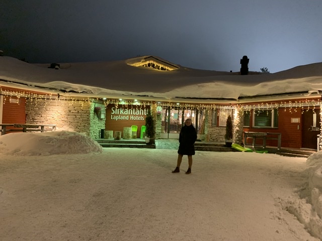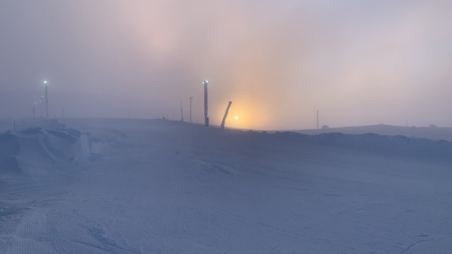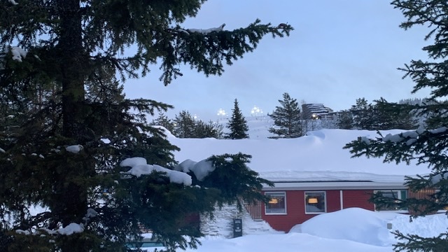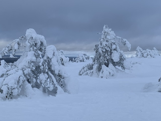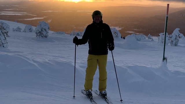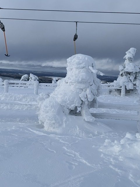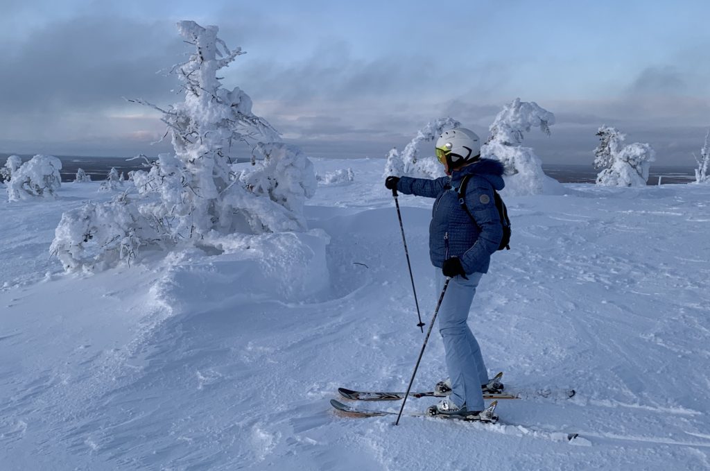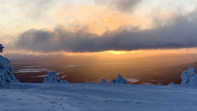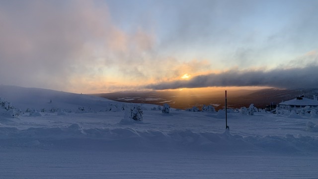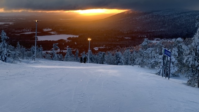 Dat is waar we ons in wanen vandaag. We hebben geen bijzondere dingen gedaan, ‘alleen maar’ een dagje op de pistes doorgebracht. Skiën hier is niet moeilijk of ingewikkeld. De meeste pistes zijn ‘rood’ aan de ene kant van het gebied en ‘blauw’ aan de andere kant. Maar dat is eigenlijk helemaal niet waar het om gaat. De omgeving waar je doorheen skiet is iedere keer weer adembenemend. Vandaag vooral ook door de enorme storm die over de vlakten raast zodat zelfs de sleeplift moeite lijkt te hebben om je omhoog te krijgen. Die sleepliften is wel een dingetje overigens. Man, man, man, wat zijn wij verwend geraakt in Oostenrijk. Overal gondels, stoeltjesliften en paddestoelliftjes. De ankerlift is daar een ouderwetse gegeven. Nou, hier in Finland niet. Kilometerslange ankerliften trekken je omhoog naar de volgende afstapplaats. Dat is wel even wennen, mijn dijbeenspieren zijn dat niet meer gewend haha. Dus voor het eerst sinds jaren: spierpijn….