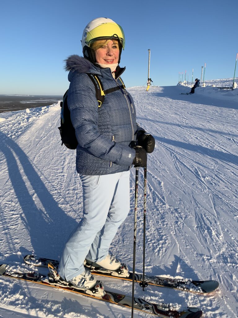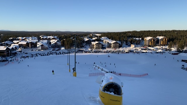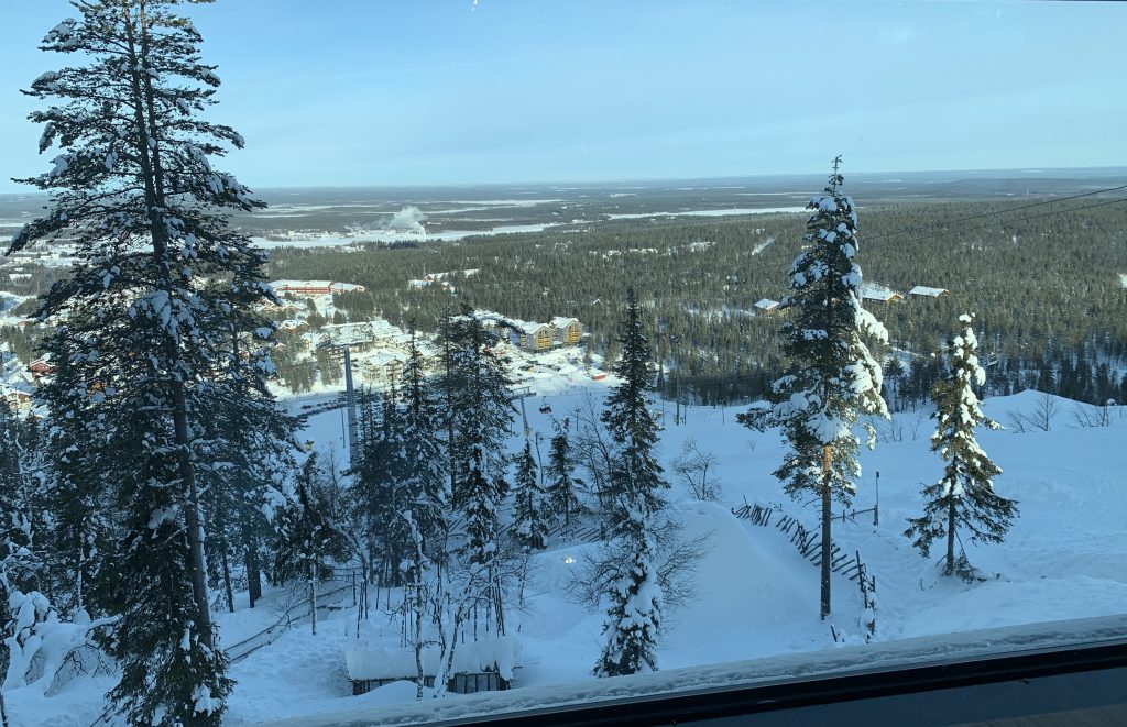 Twee keer twee dagen hebben we gevuld met skiën, koffie drinken op of aan de piste, genieten van alle uitzichten en het geluid van de sneeuw, kou geleden (het was echt koud) maar vooral ons steeds weer verwonderd over de prachtige omgeving. Het leuke van skiën in Levi is dat je, als je eenmaal naar boven gehesen bent, waanzinnig van het uitzicht kunt genieten. In tegenstelling tot de Alpen waar je, vanwaar je ook kijkt, nooit verder kunt kijken dan de volgende berg, kun je hier mijlenver in de omtrek om je heen kijken. Dat komt omdat het skigebied eigenlijk gewoon een bult in het landschap is (oneerbiedig gezegd maar het is wel zo). En van die bult hebben ze heel handig een mooi gebied gemaakt.