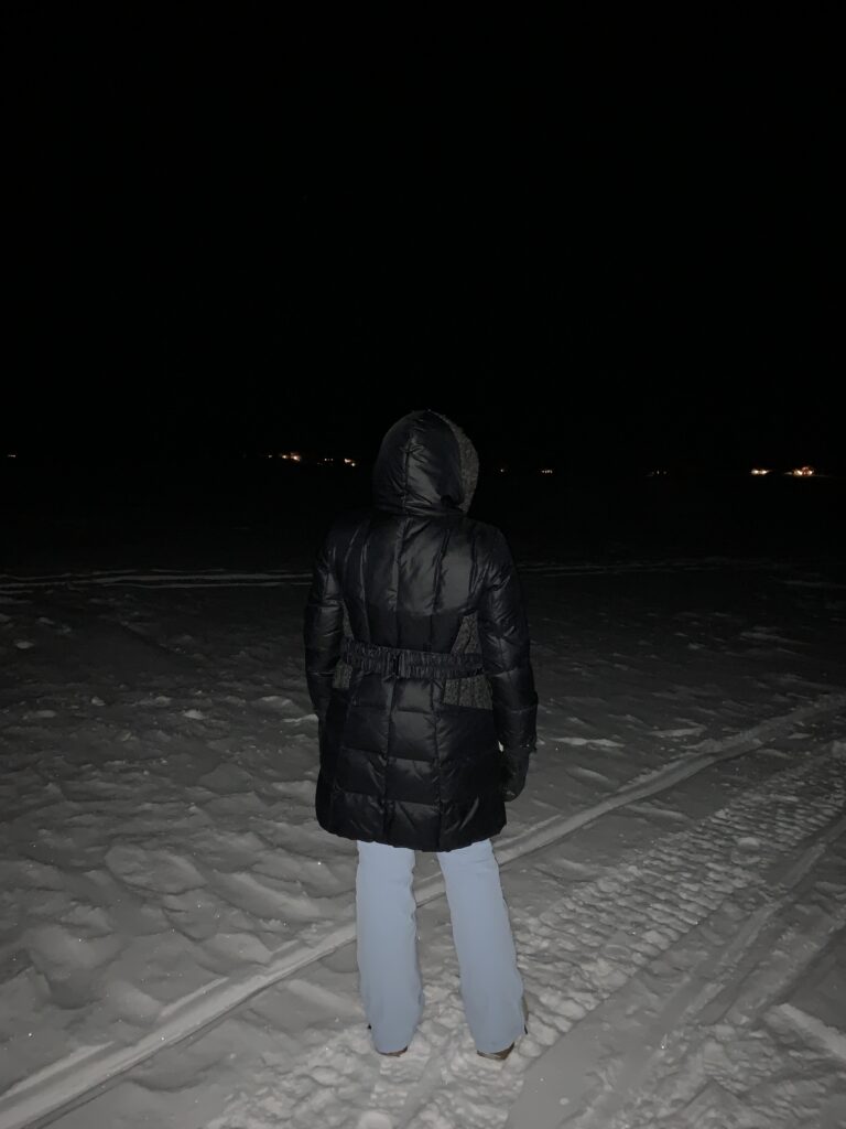 Op twee avonden na zijn we iedere dag ‘s avonds tussen 20.00 en 22.00 uur naar de plek gelopen waar je de beste uitkijkpost had om het Noorderlicht te kunnen spotten. Een groot meer, 15 minuten lopen vanaf ons hotel. Daar ga je dan heen en dan sta je op het bevroren meer in -10 tot -20 gr.C met z’n allen naar de lucht te staren. Alle avonden zijn we onverrichte zake weer terug gekeerd. Op een avond zijn we zelfs twee keer heen-en-weer gelopen…. Hoe mal kun je zijn?