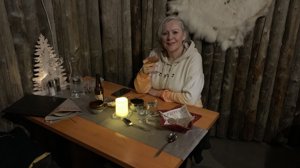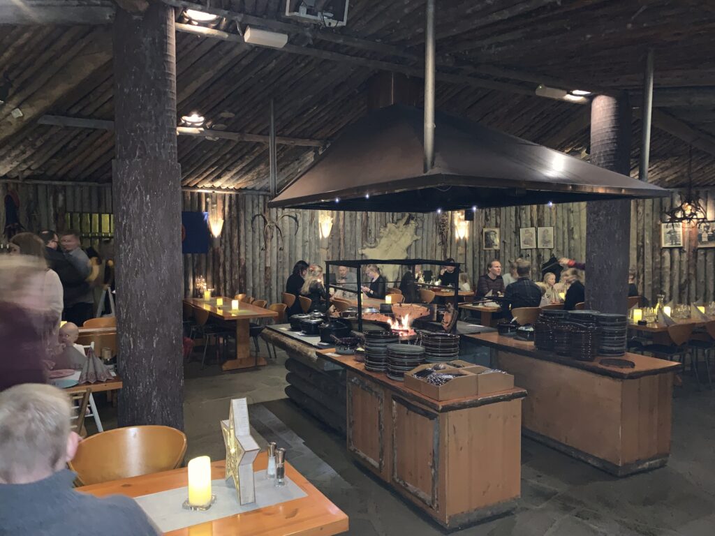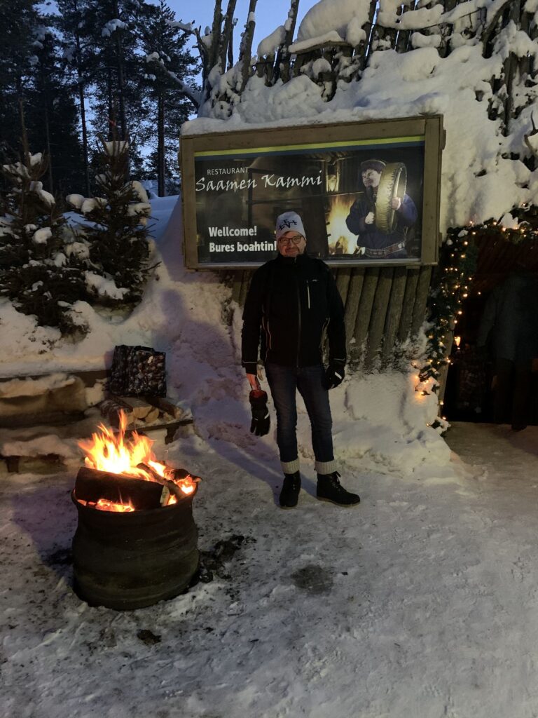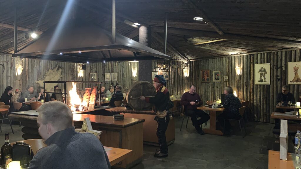 Maandagavond hebben we ons laten verleiden om in een ‘echt’ Sami restaurant te gaan eten. Heerlijk, half onder de grond, helemaal van hout met het bekende vuur in het midden. Dat vuur was nu om planken met zalm te roken en de rest werd gewoon in de aangrenzende keuken gemaakt. Groente en rendiervlees in alle varianten. Het was geweldig lekker. Aan het eind kwam er een mannetje een paar liederen zingen zichzelf begeleidend op een traditionele Sami trommel. Die wij overigens weer erg vonden lijken op de Keltische Bodhran.