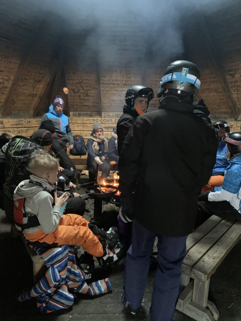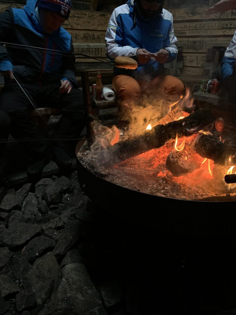 Overal verspreid duiken ineens ronde hutjes op, met een gat in het midden waar rook uitkomt. Dat maakte mij nieuwsgierig dus moeten we even gaan kijken. Binnen kom je dan in een kleine ruimte met in het midden een flink vuur. Er omheen houten banken gevuld met mensen die worstjes aan het verwarmen zijn. Een beetje zoals wij dat met broodjes en marshmallows doen. Uit de rugzakken komen flessen ketchup en andere sauzen. Heel gezellig allemaal.