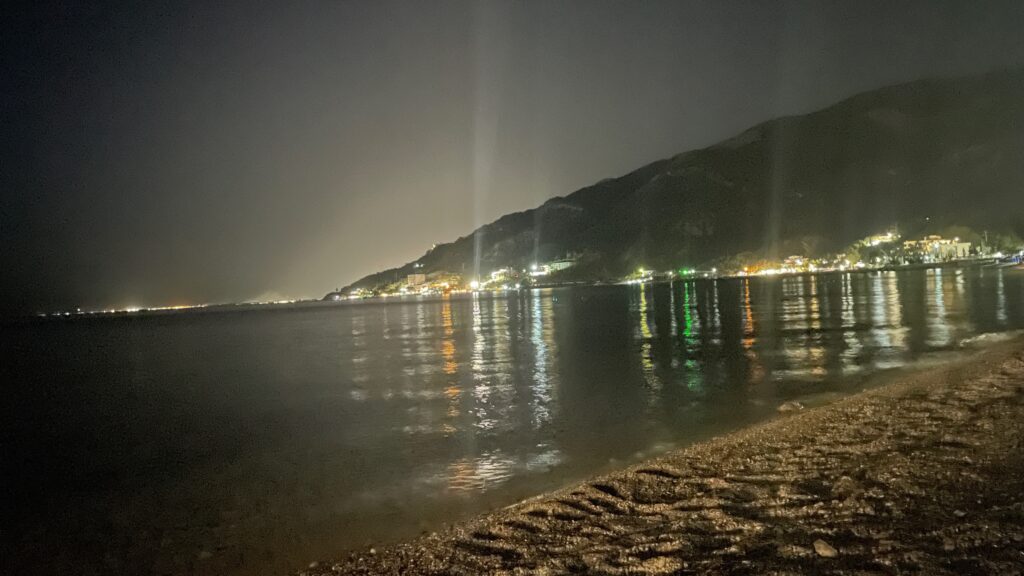 We zitten het donker met de campingstoelen aan de waterlijn op het strand naar de sterren kijken. En de lichtjes langs de kust.