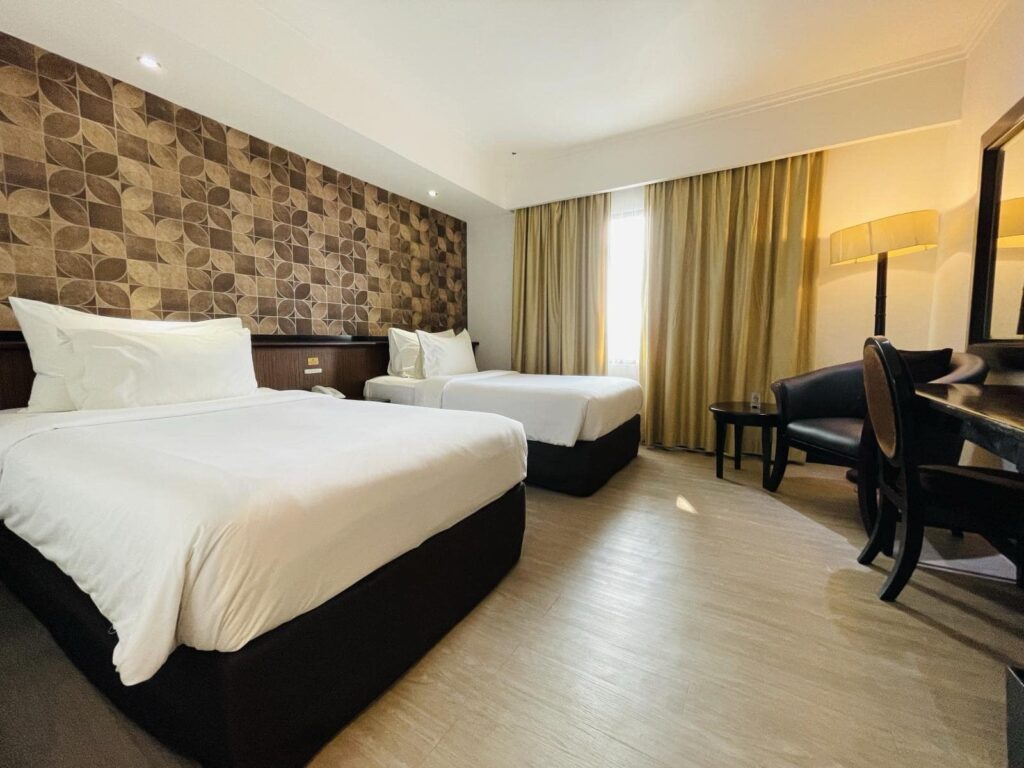 De vochtige hitte sloeg als een klamme deken om ons heen. Gelukkig hoeven we nergens heen, we hebben we hebben een Twin-double room geboekt in het Jakarta Airport hotel. Dit hotel ligt aan Terminal 2, op loopafstand van de aankomsthal. Het heeft een eigen restaurant en ontbijten kun je al vanaf 03.00 uur.